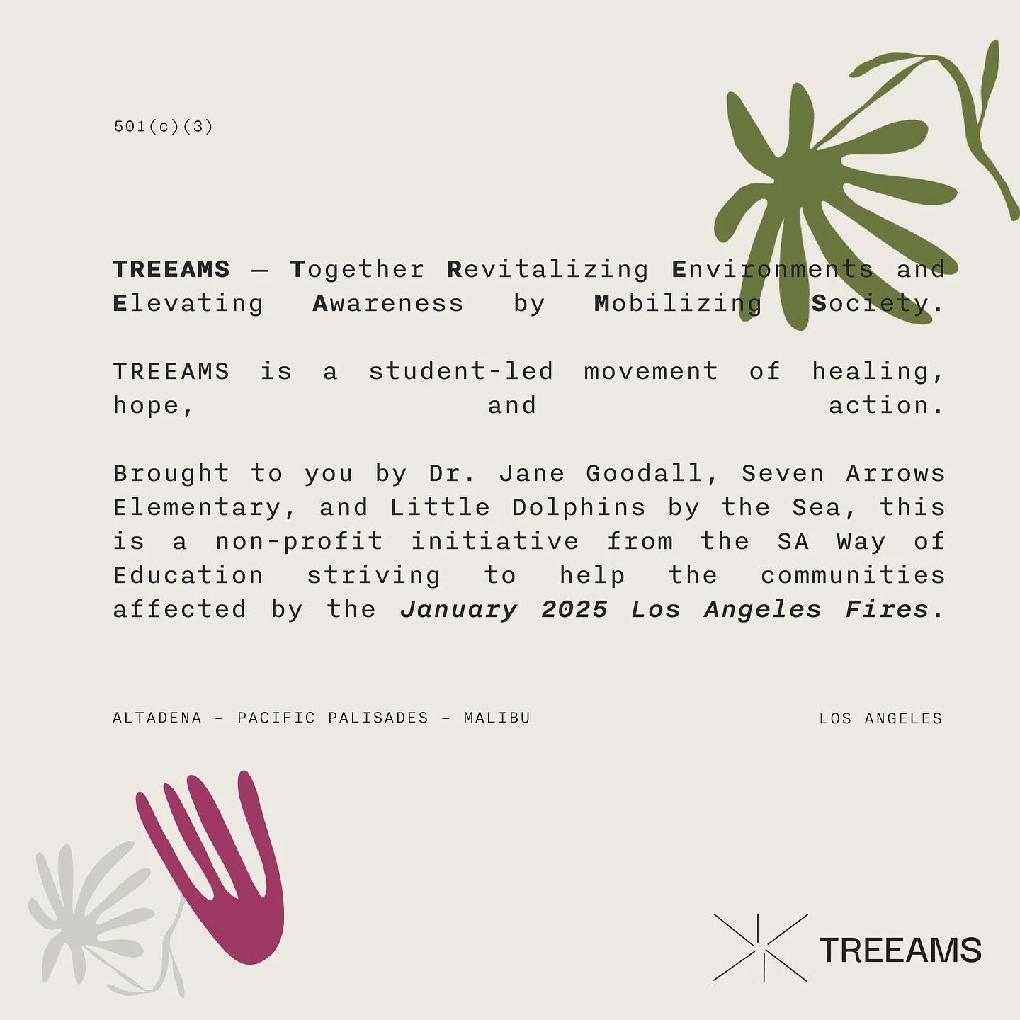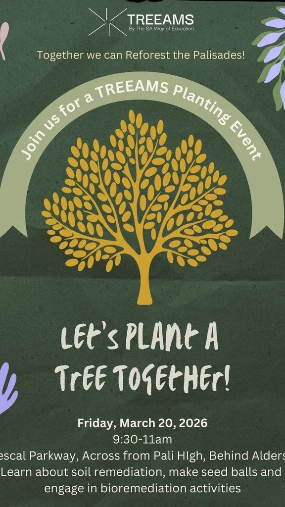 TREEAMS is empowering students to lead the ecological and emotional renewal of their communities. Through environmental education, tree mapping, and large-scale tree planting, the project seeks to transform grief into action by restoring burned landscapes, replanting lost trees, and cultivating resilience. Students will learn from local experts which trees to plant, how to plant them and how to keep the newly planted trees thriving.