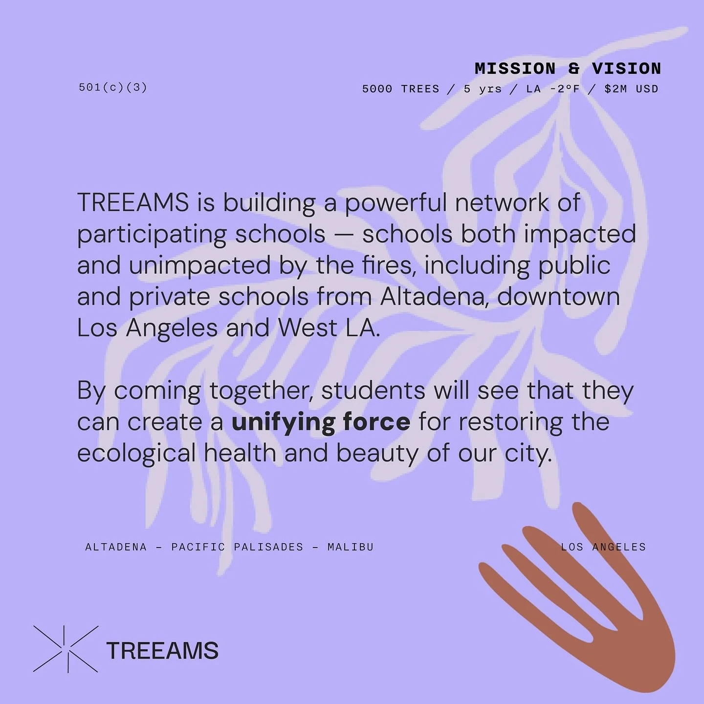 TREEAMS (Trees + Dreams) was born as a student-led movement of healing, hope and action. TREEAMS empowers students to come together across the city to plant trees, restore optimism, and reimagine Los Angeles as a greener, more resilient city for generations to come.